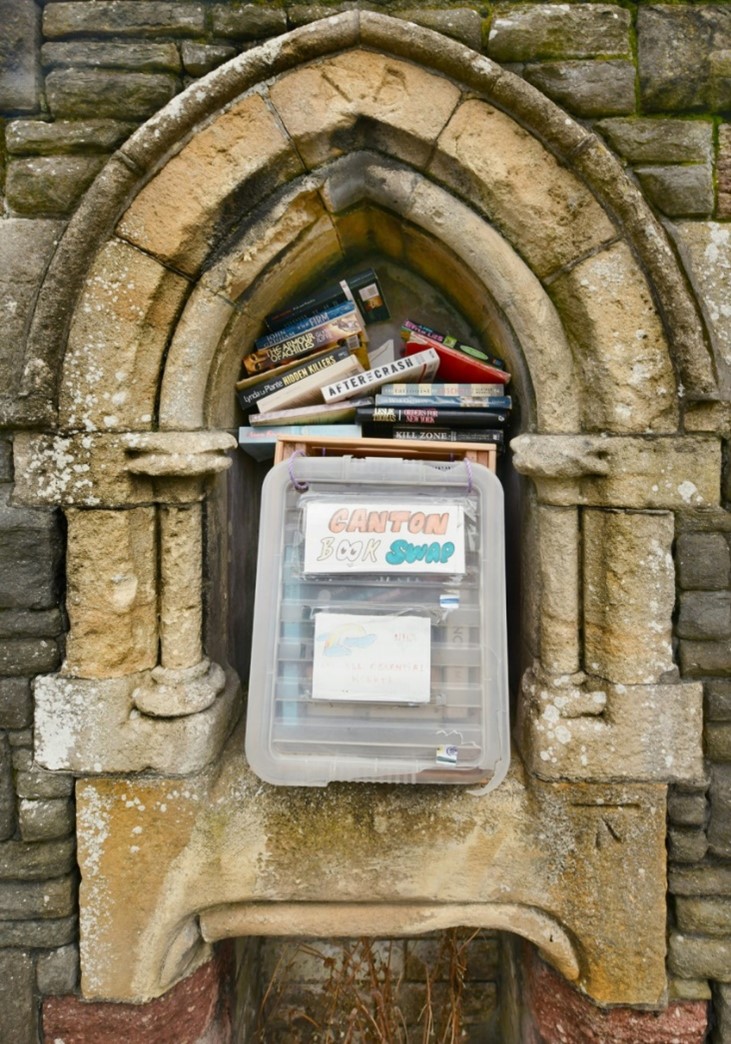 2020, argraffwyd y geiriau: ‘Canton Book Swap’. Er mai gwell, gan